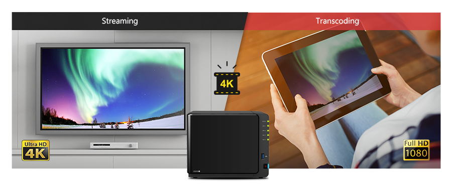 DS916+ 搭載硬件加速轉(zhuǎn)碼引擎,能轉(zhuǎn)文件并串流 H.264 4K 以及 1080p 視頻至高分辨率電視、數(shù)字播放器、手持設(shè)備以及電腦,讓你更輕松方便地觀看視頻,不再需要安裝第三方播放器*。