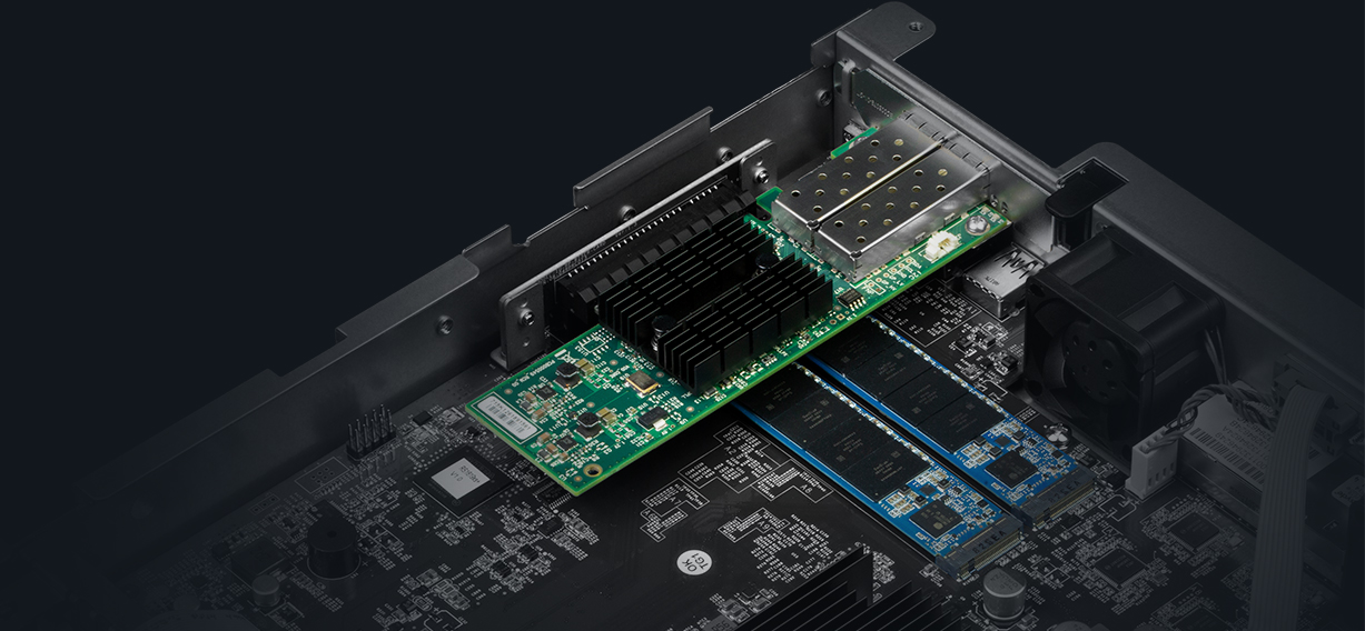配備 PCIe 3.0 插槽,RS1619xs+ 支持安裝 10GbE/25GbE NIC 以實現(xiàn)快速數(shù)據(jù)傳輸。內置 M.2 2280 SSD 緩存插槽能進一步增強 IO 密集型任務,如虛擬化或郵件服務器部署。
