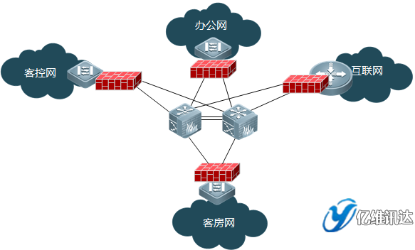 通過銳捷核心交換機的防火墻模塊的虛擬防火墻功能,對客控網(wǎng)、客房網(wǎng)、辦公網(wǎng)進行安全防護,將病毒/攻擊隔離在本地,不影響其他區(qū)塊正常運行。